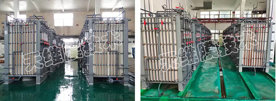 化成箔生產(chǎn)的腐蝕工段會產(chǎn)生硫酸/硫酸鋁、硝酸/硝酸鋁廢水,采用擴散滲析裝置可將廢酸中的硫酸、硝酸進行有效回用,代替?zhèn)鹘y(tǒng)的中和處理法,大幅度降低了殘渣量和含鹽量,酸回收率>80%,金屬離子截留率>90%。目前,擴散滲析酸回收技術(shù)在化成箔行業(yè)廢酸處理中覆蓋率已達85%以上。